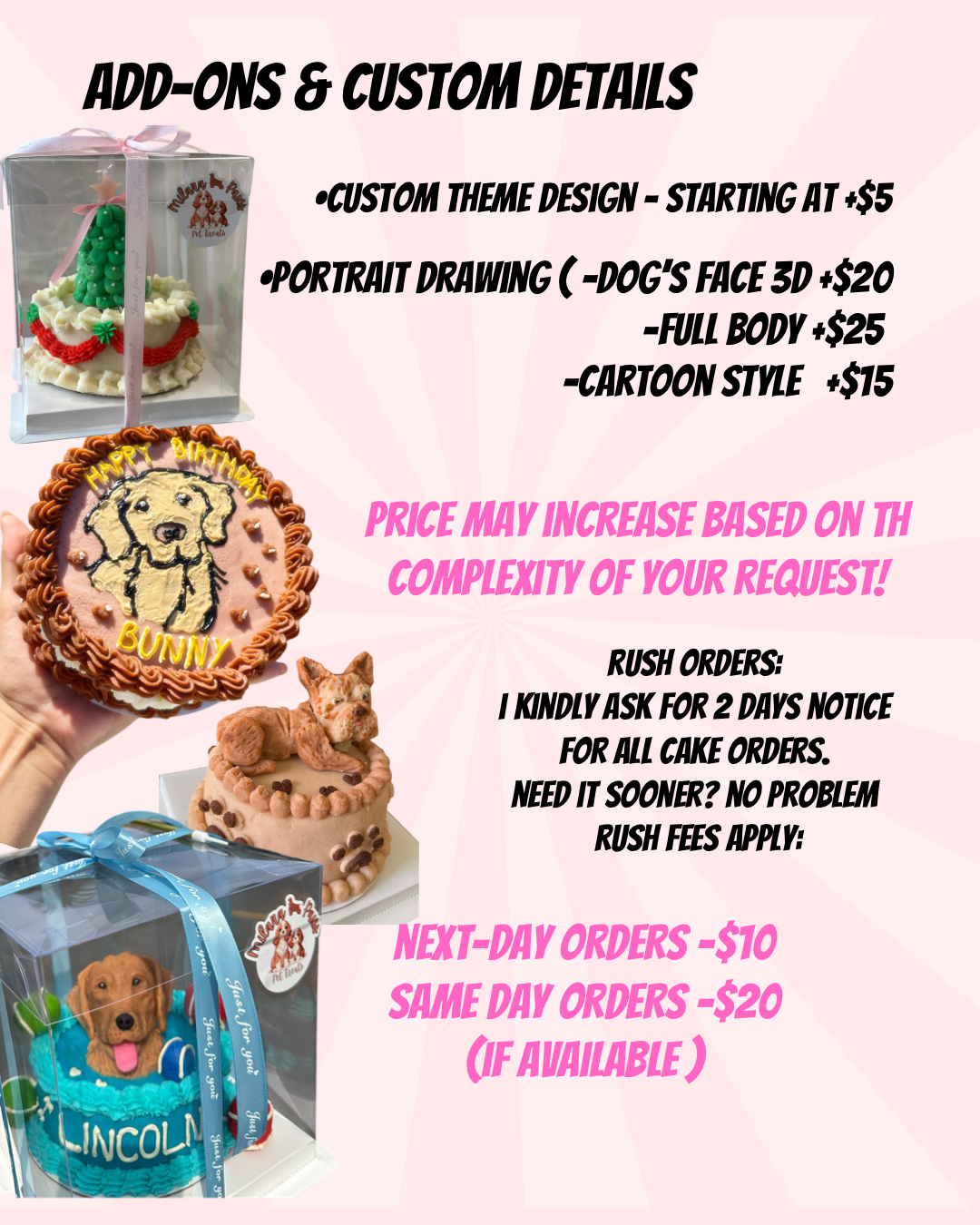 All cakes are custom made, and ordered directly through Instagram DM so we can fully personalize your dog's cake together.